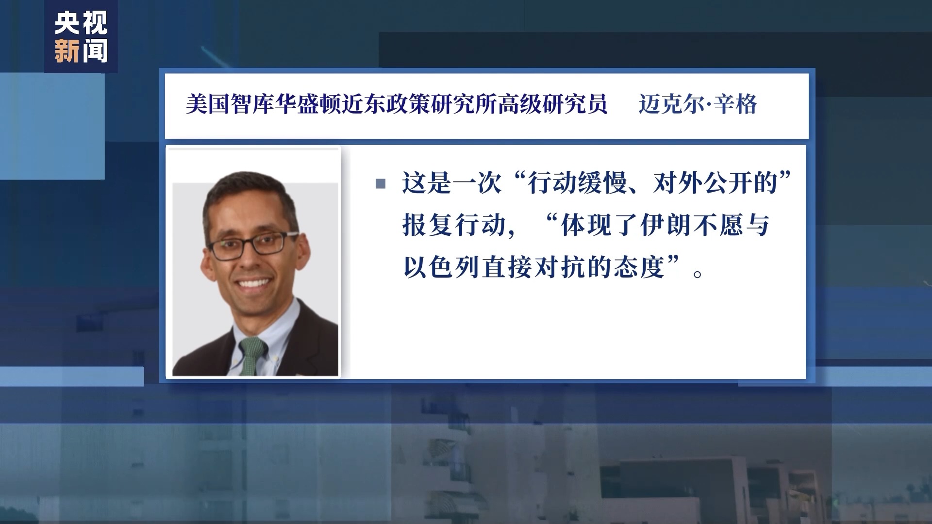 美國(guó)智庫華盛頓近東政策研究所高級(jí)研究員邁克爾·辛格評(píng)論,這是一次“行動(dòng)緩慢、對(duì)外公開的”報(bào)復(fù)行動(dòng),“體現(xiàn)了伊朗不愿與以色列直接對(duì)抗的態(tài)度”。