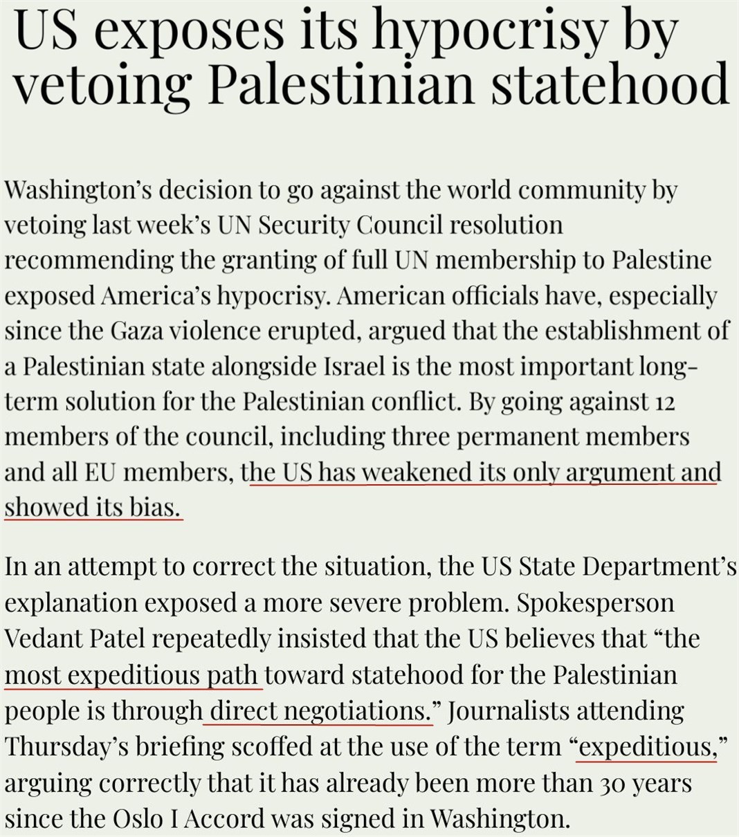 沙特阿拉伯“阿拉伯新聞”網(wǎng)站日前在題為《美國(guó)否決巴勒斯坦成為聯(lián)合國(guó)會(huì)員國(guó)暴露了其虛偽性》的文章中指出,美國(guó)官員曾表示,建立一個(gè)與以色列毗鄰的巴勒斯坦國(guó)是巴以沖突最重要的長(zhǎng)期解決方案,尤其是在本輪巴以沖突爆發(fā)后。但在安理會(huì)近日表決中,美國(guó)卻與12個(gè)安理會(huì)成員以及所有歐盟成員國(guó)唱了反調(diào),顯示了其一直存在的偏見。