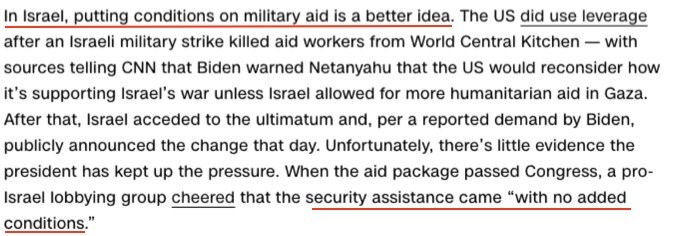 文章認(rèn)為,給對(duì)以色列軍事援助附加條件是個(gè)更好的主意。但不幸的是,幾乎沒(méi)有證據(jù)表明拜登在持續(xù)施加壓力。當(dāng)新援助計(jì)劃在國(guó)會(huì)通過(guò)時(shí),一個(gè)親以色列的游說(shuō)團(tuán)體曾歡呼說(shuō),美國(guó)對(duì)以新安全援助“沒(méi)有附加條件”。