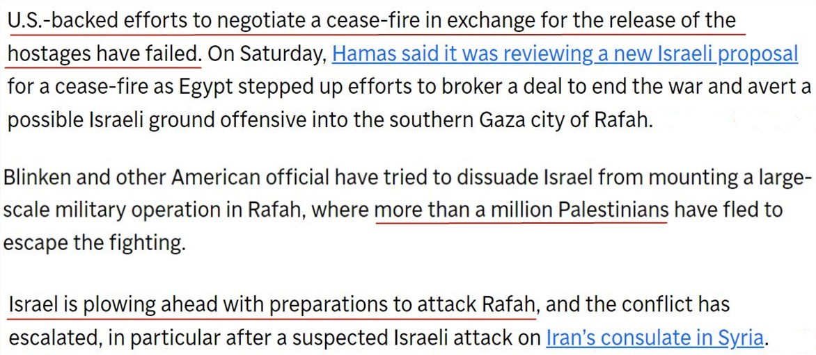 美聯(lián)社日前直言,美國(guó)支持的以釋放人質(zhì)為交換條件的?;鹫勁惺×恕2剂挚虾推渌绹?guó)官員曾試圖勸阻以色列不要在拉法發(fā)動(dòng)大規(guī)模軍事行動(dòng),因?yàn)橐延?00多萬(wàn)巴勒斯坦人為躲避戰(zhàn)火而逃往拉法,但以色列正在加緊準(zhǔn)備攻擊拉法,沖突已經(jīng)升級(jí)。