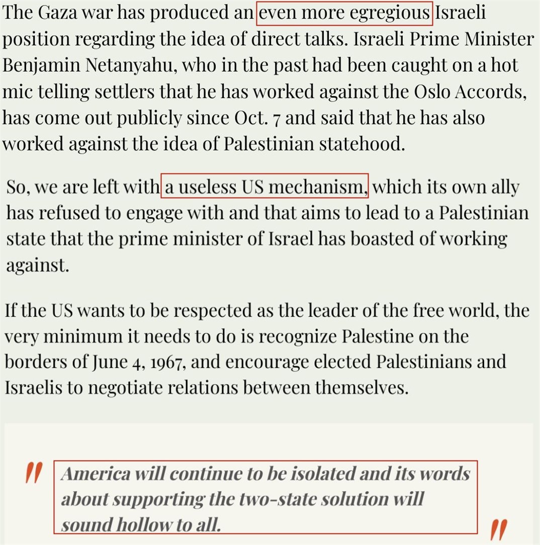 文章稱,加沙戰(zhàn)爭(zhēng)使以色列對(duì)直接談判的態(tài)度更加惡劣。內(nèi)塔尼亞胡已公開表示反對(duì)巴勒斯坦建國(guó)的想法。“留給我們的只是一個(gè)毫無(wú)用處的美國(guó)機(jī)制”。如果美國(guó)想受到尊重,最起碼要做的就是承認(rèn)1967年邊界內(nèi)的巴勒斯坦國(guó)。