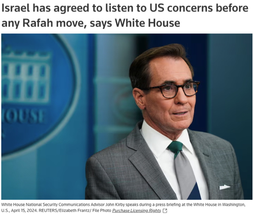 美國(guó)白宮國(guó)家安全委員會(huì)戰(zhàn)略溝通協(xié)調(diào)員約翰·柯比當(dāng)天在接受采訪時(shí)表示,以色列已經(jīng)同意在進(jìn)攻拉法之前“聽取美國(guó)的關(guān)切和意見”。