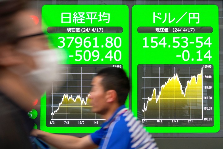 2024年4月17日,東京街道上的電子板顯示東京證券交易所的收盤數(shù)據(jù)(左)和日元對美元匯率(右)。(法新社)