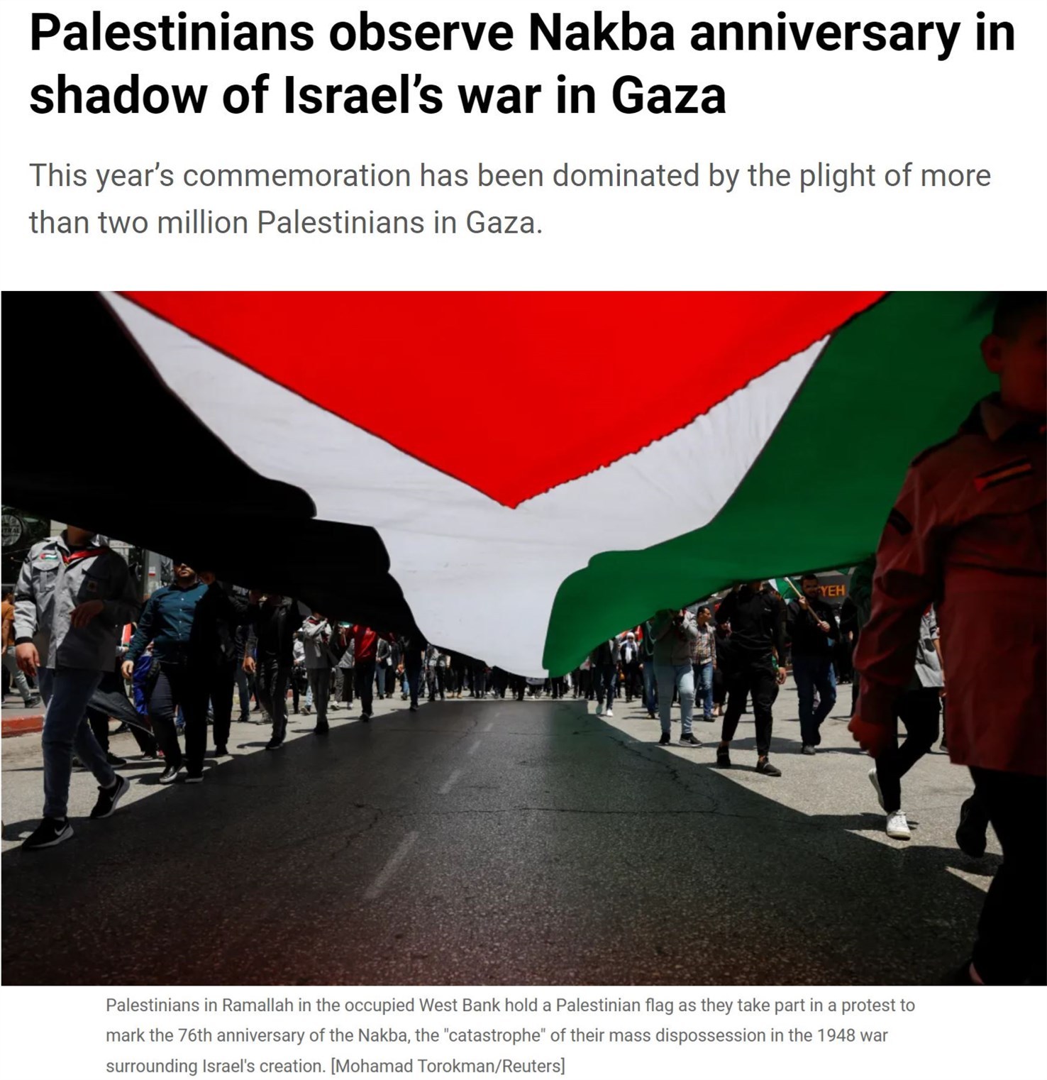 1948年5月14日,以色列宣布建國(guó)。次日,第一次中東戰(zhàn)爭(zhēng)爆發(fā),數(shù)十萬(wàn)巴勒斯坦人淪為難民。此后,巴勒斯坦將每年的5月15日命名為“災(zāi)難日”。