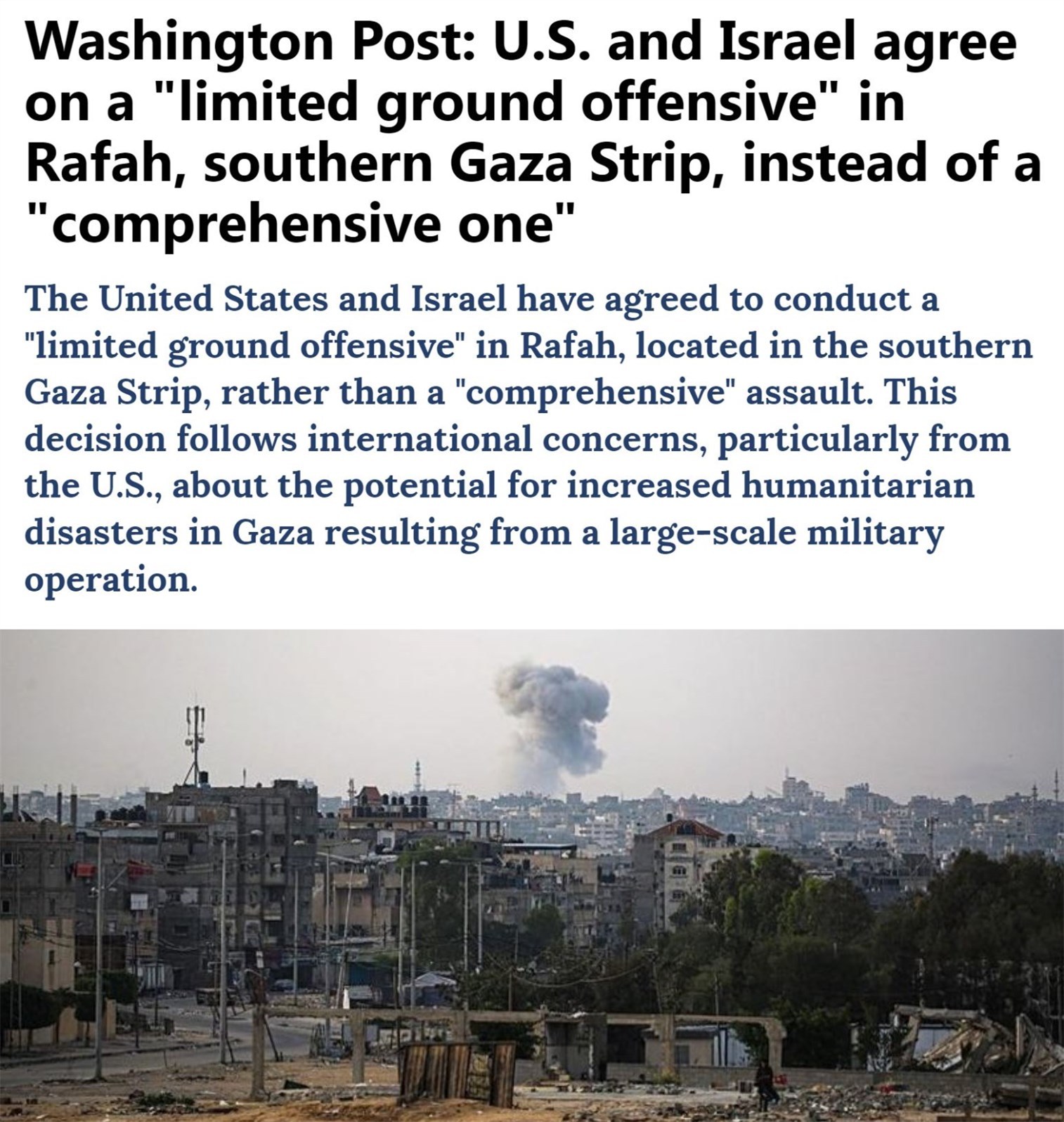 據(jù)美國《華盛頓郵報》近日報道,以色列在同美國協(xié)商后,選擇“暫時擱置”對加沙地帶南部城市拉法的大規(guī)模全面地面進攻計劃,選擇采取“更有限”的行動。