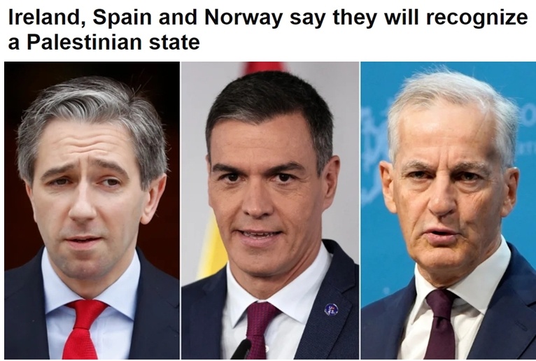 當(dāng)?shù)貢r間22日,挪威、愛爾蘭、西班牙三國宣布承認(rèn)巴勒斯坦國。