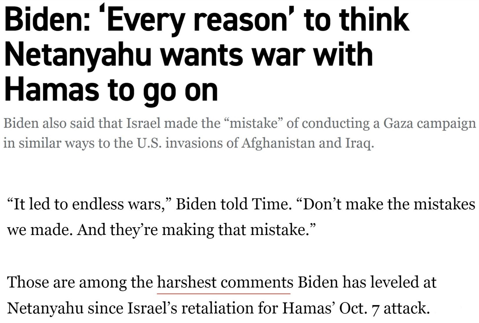 美國《政治報》網(wǎng)站評論稱,這是拜登對內(nèi)塔尼亞胡最嚴厲的措辭之一。拜登是在暗示內(nèi)塔尼亞胡不希望戰(zhàn)爭結(jié)束,以便繼續(xù)掌權(quán)。