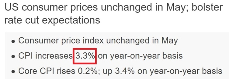 美國勞工統(tǒng)計局12日公布的數(shù)據(jù)顯示,5月美國消費者價格指數(shù)(CPI)環(huán)比保持不變,同比增長3.3%,這意味著,美國通脹水平仍居高不下。