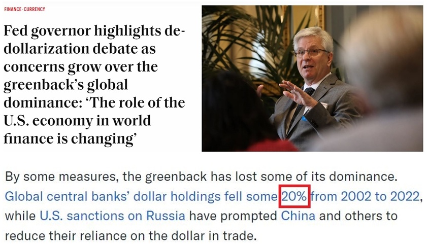 文章指出,2002到2022年,全球央行的美元儲備減少約20%;此外,美國對俄羅斯實施的制裁則促使其他國家在貿(mào)易中減少對美元的依賴。