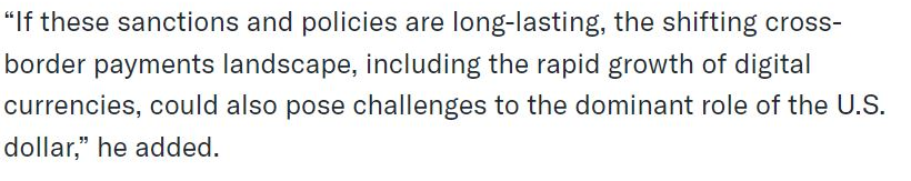 “如果這些制裁措施和政策長期持續(xù)下去,跨境支付格局的變化,包括數(shù)字貨幣的快速增長,都可能對美元的主導地位構(gòu)成挑戰(zhàn)。”