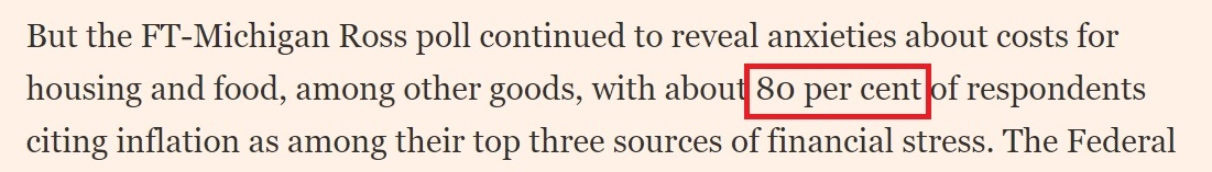 英國《金融時報》與密歇根大學羅斯商學院聯(lián)合進行的最新調(diào)查顯示,美國人對住房和食品等商品的成本感到焦慮,約80%的受訪者表示,通脹是他們財務壓力的三大來源之一。