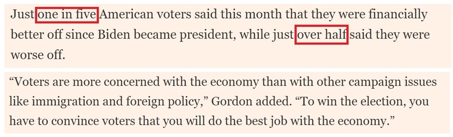 今年是美國大選年。調(diào)查結(jié)果顯示,只有五分之一的美國選民表示,他們的經(jīng)濟狀況在拜登總統(tǒng)任職期內(nèi)有所改善;超過一半的人說,他們的經(jīng)濟狀況更糟了。