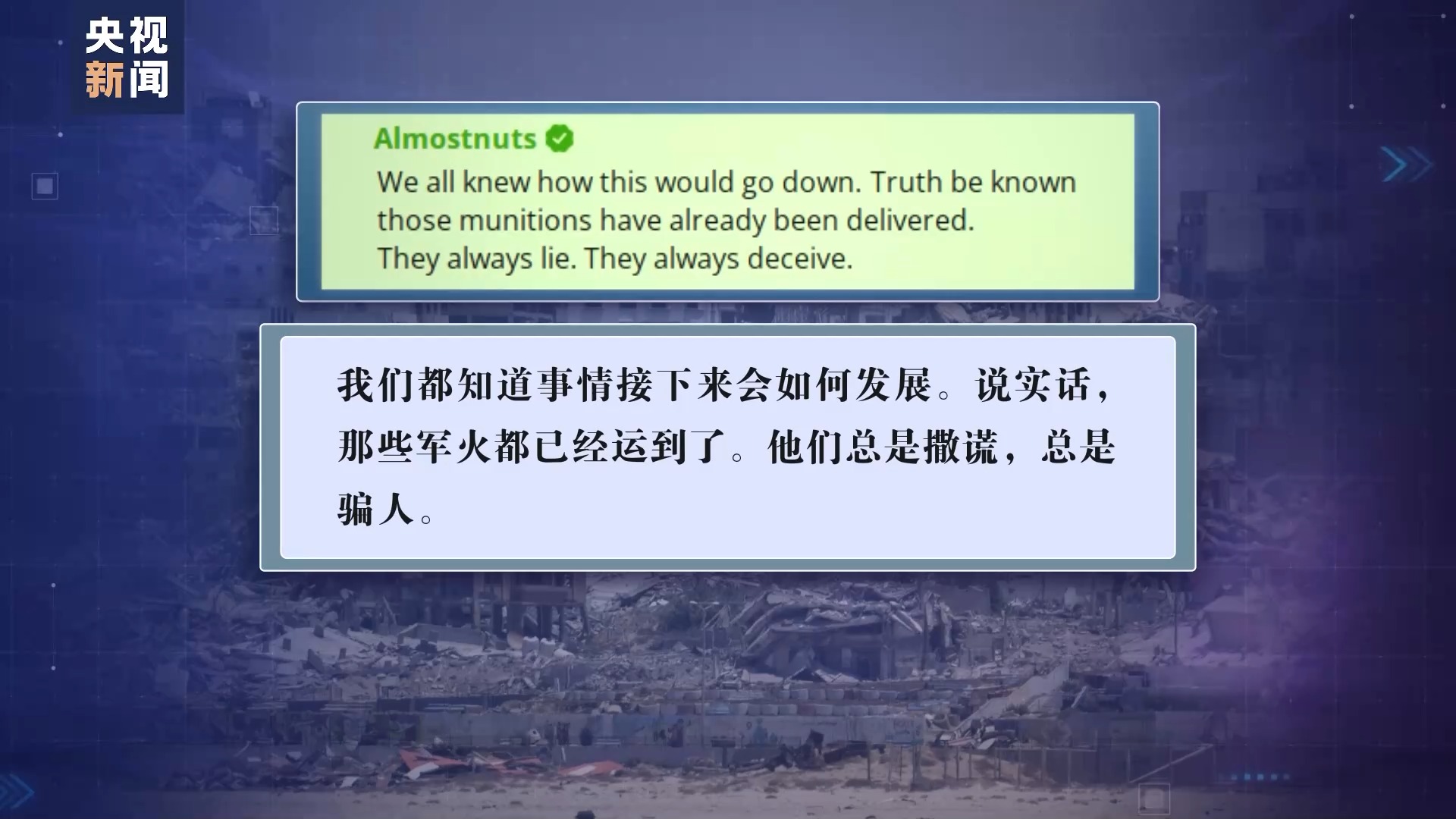 對于以色列和美國之間這場所謂的“口水戰(zhàn)”,有網(wǎng)友表示早已看穿:“我們都知道事情接下來會如何發(fā)展。說實(shí)話,那些軍火都已經(jīng)運(yùn)到了。他們總是撒謊,總是騙人。”