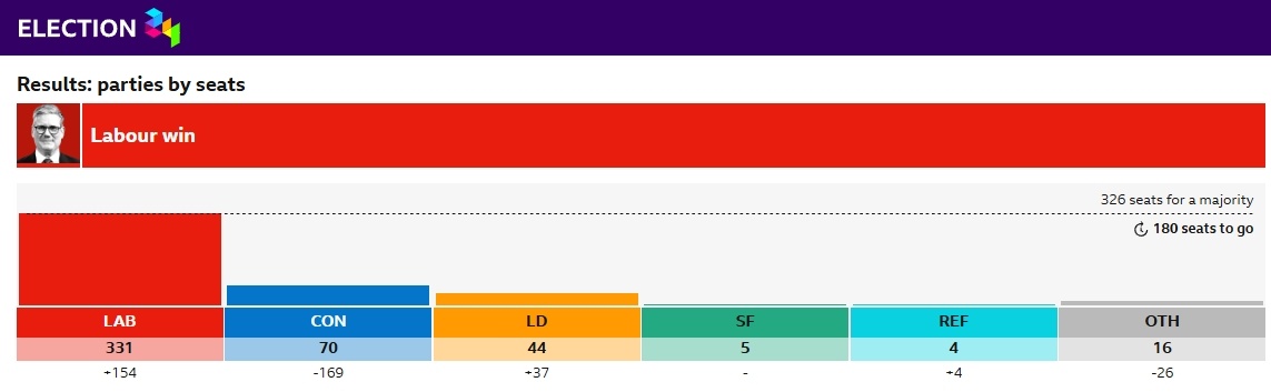 根據(jù)英國大選計(jì)票結(jié)果,當(dāng)?shù)貢r(shí)間5日凌晨,工黨在議會(huì)下院選舉中贏得超過半數(shù)席位,獲得選舉勝利。工黨黨首基爾·斯塔默將出任新一任英國首相并組建政府。