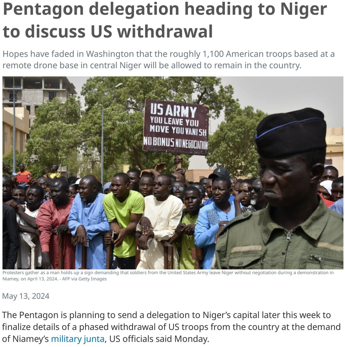 據(jù)法新社報道,當(dāng)?shù)貢r間7月6日,德國國防部表示,在與尼日爾軍政權(quán)談判失敗后,德國軍隊將于8月31日前停止運(yùn)營其在尼日爾首都尼亞美的航空運(yùn)輸基地。