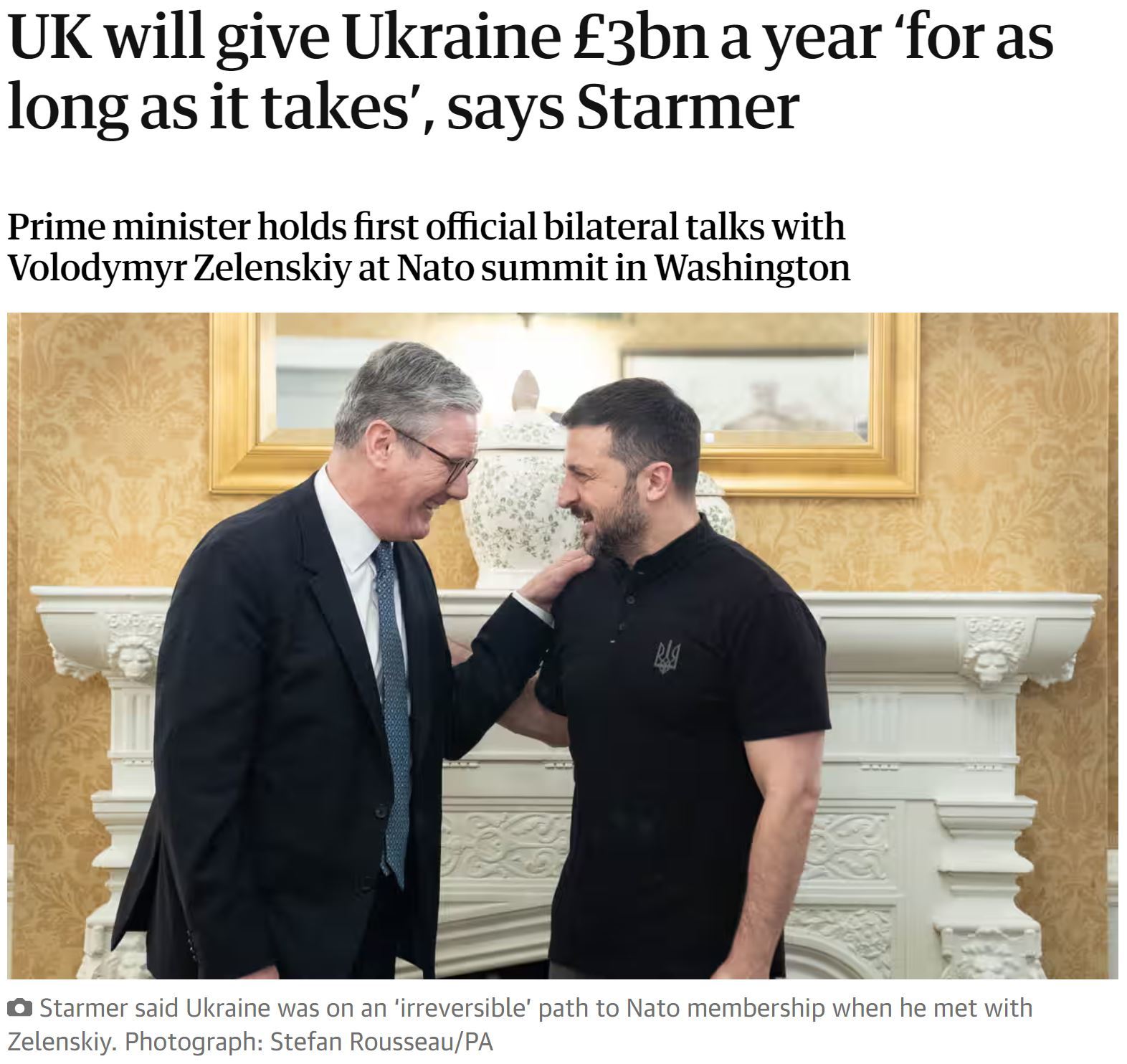 在對烏克蘭援助問題上,斯塔默在北約峰會期間承諾,每年向烏克蘭提供30億英鎊(約合282億元人民幣)的軍事支援將延續(xù)到2030至2031財年。