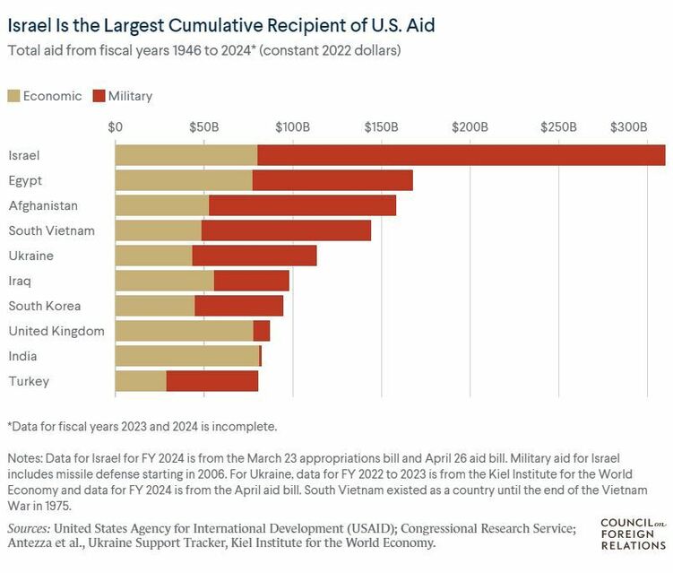 美國外交關(guān)系協(xié)會不久前發(fā)布的統(tǒng)計報告顯示,從二戰(zhàn)結(jié)束后的1946年到今年,以色列一直是美國對外援助的最大接受國,累計接受美援約3100億美元,遠遠超過其他國家。