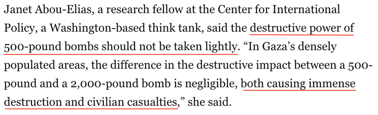 華盛頓智庫“國際政策中心”研究員珍妮特·阿布-埃利亞斯認為,“在加沙人口稠密地區(qū),500磅炸彈和2000磅炸彈的轟炸效果可以忽略不計,因為兩者都會造成巨大的破壞和平民傷亡”。