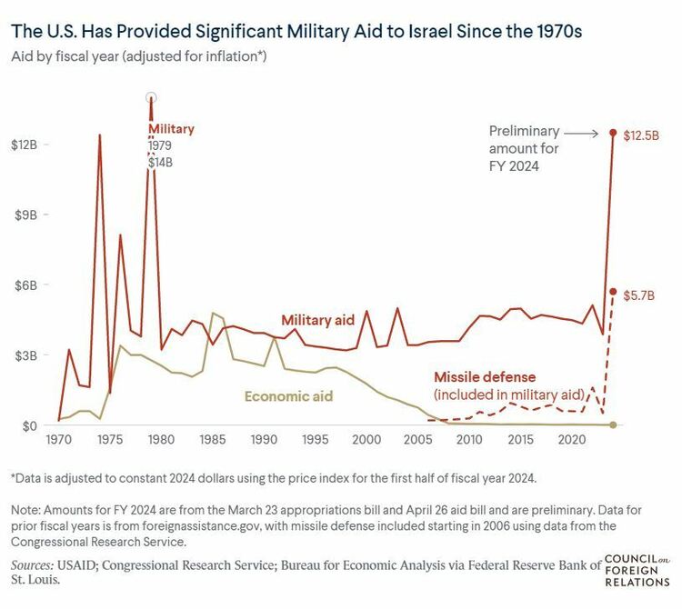 僅自本輪巴以沖突爆發(fā)以來,美國就已通過立法向以色列提供了至少125億美元的軍援。