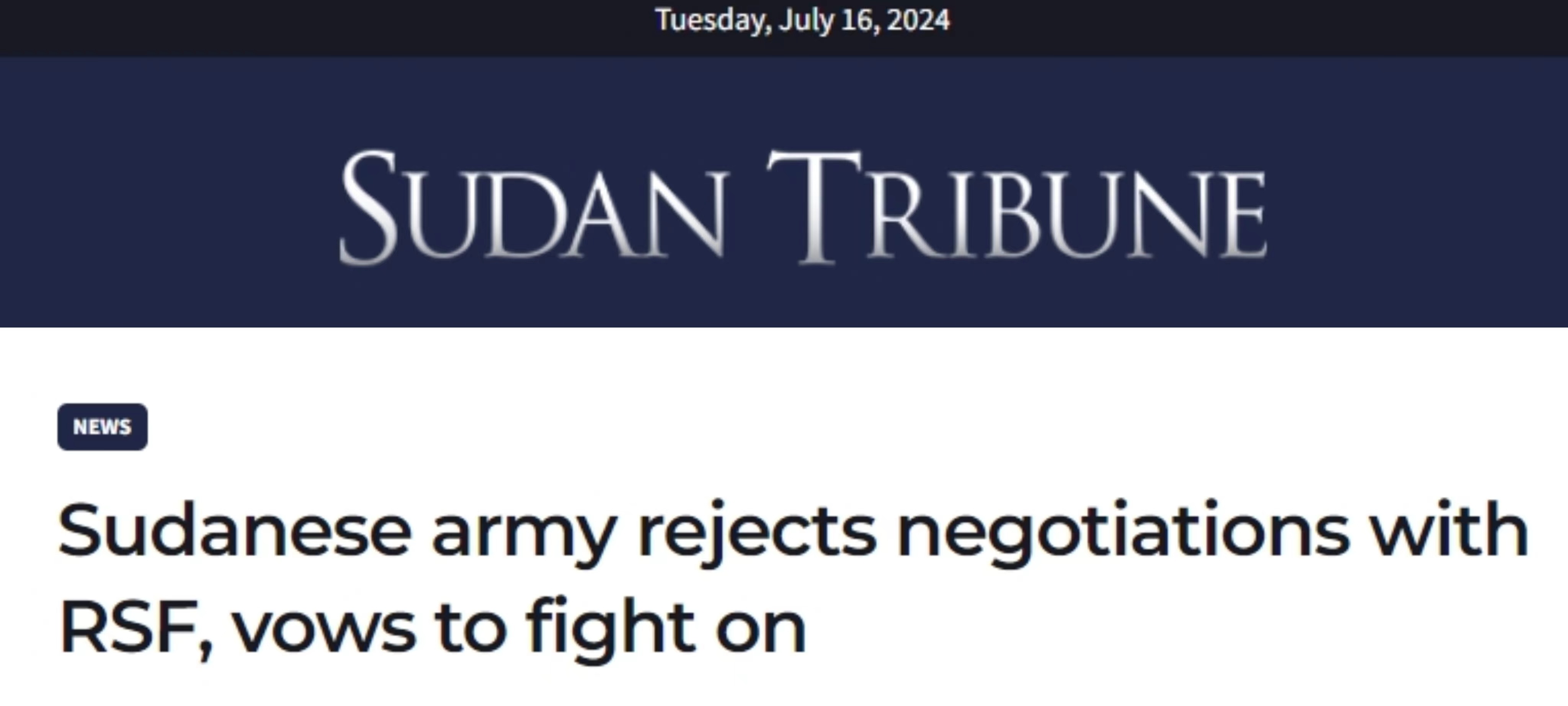 當(dāng)?shù)貢r(shí)間7月15日,蘇丹武裝部隊(duì)高級(jí)將領(lǐng)兼主權(quán)委員會(huì)成員亞西爾·阿塔表示,除非快速支援部隊(duì)向蘇丹武裝部隊(duì)投降,否則蘇丹武裝部隊(duì)不會(huì)與其進(jìn)行談判。