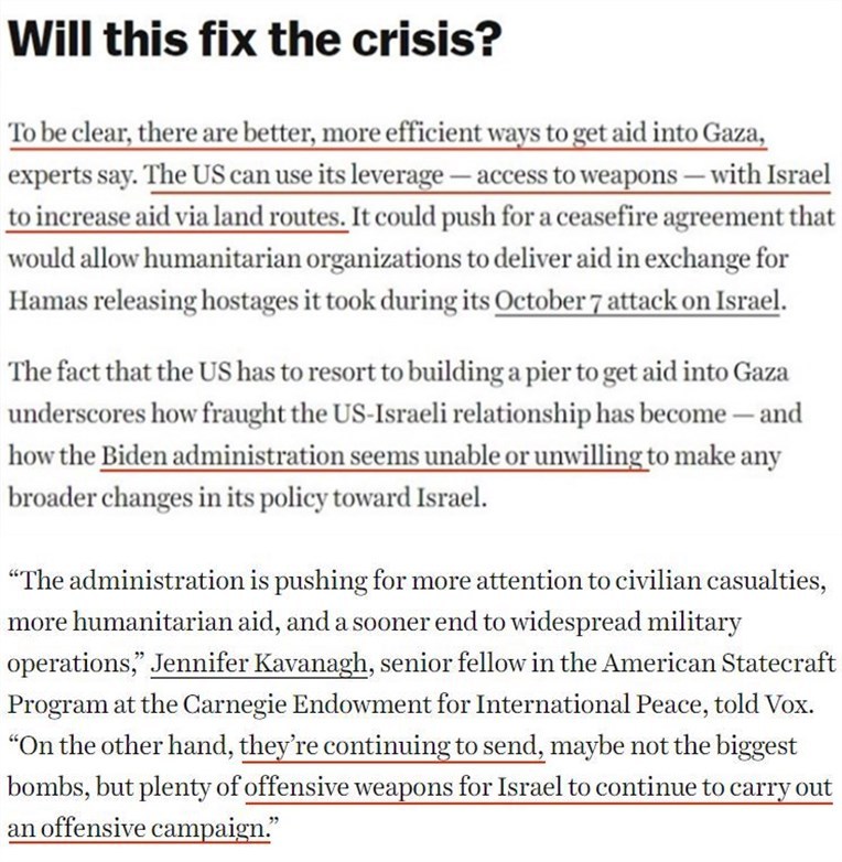 美國沃克斯新聞網(wǎng)援引分析人士的話報道稱,美國可以利用其對以色列的影響力施壓要求通過陸路增加援助。它可以推動達(dá)成一項?;饏f(xié)議,允許人道主義組織提供援助。然而,美國不得不通過修建碼頭來向加沙運(yùn)送援助物資,這凸顯了美以關(guān)系已經(jīng)變得多么令人擔(dān)憂,美國政府似乎無法或不愿對其以色列政策做出任何改變。
