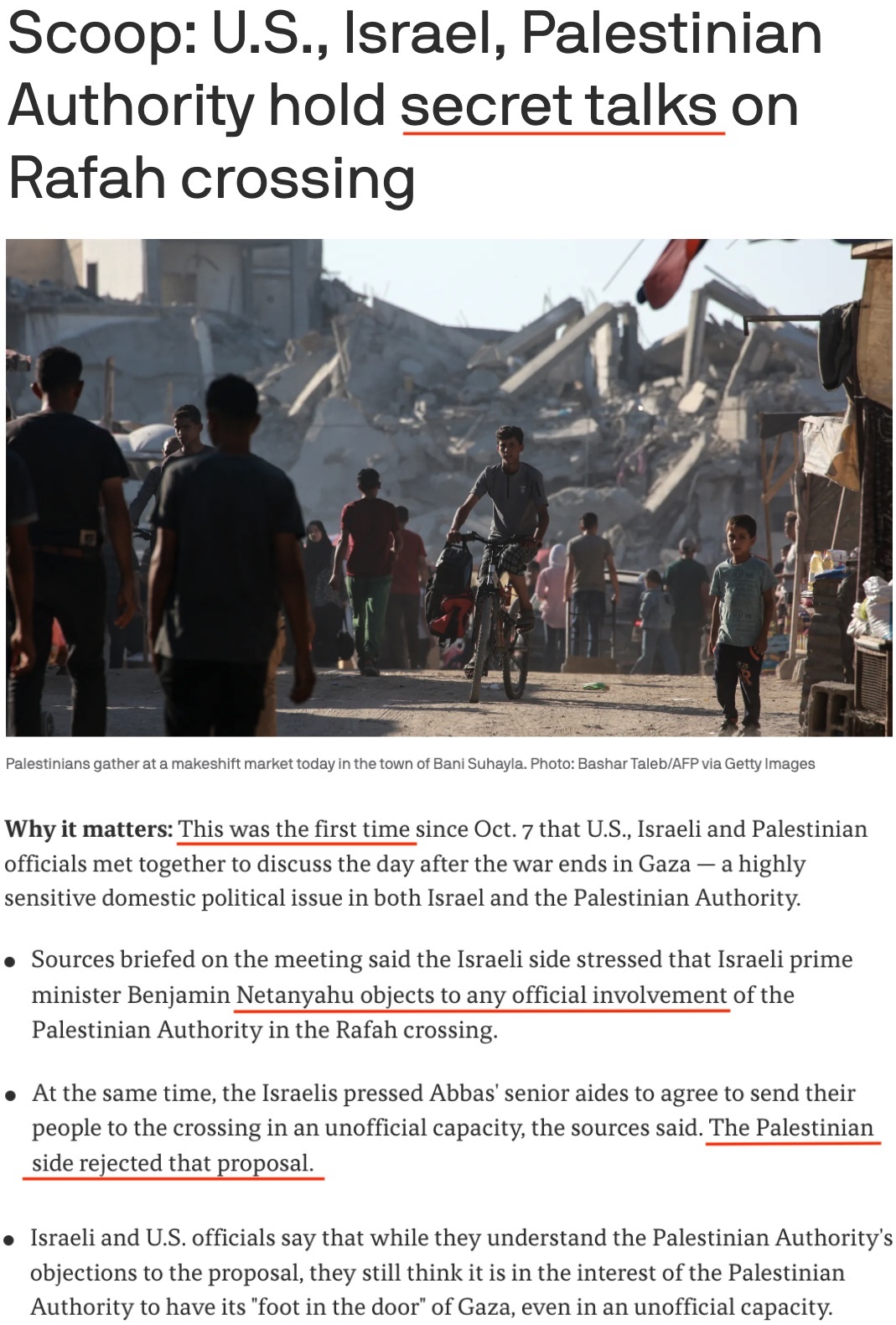 有消息說,近日以色列、美國和巴勒斯坦民族權(quán)力機(jī)構(gòu)三方代表舉行了秘密會談,就拉法口岸控制權(quán)以及加沙戰(zhàn)后治理等問題進(jìn)行磋商,這是自去年10月7日本輪巴以沖突爆發(fā)后,三方首次舉行會談。