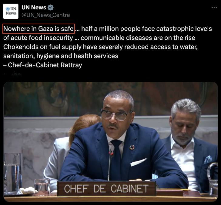 在聯(lián)合國安理會當(dāng)?shù)貢r間7月17日就中東局勢舉行的高級別會議上,聯(lián)合國秘書長辦公廳主任拉特雷通報,當(dāng)前加沙地帶沒有一處是安全的,人道主義挑戰(zhàn)越來越嚴(yán)峻。