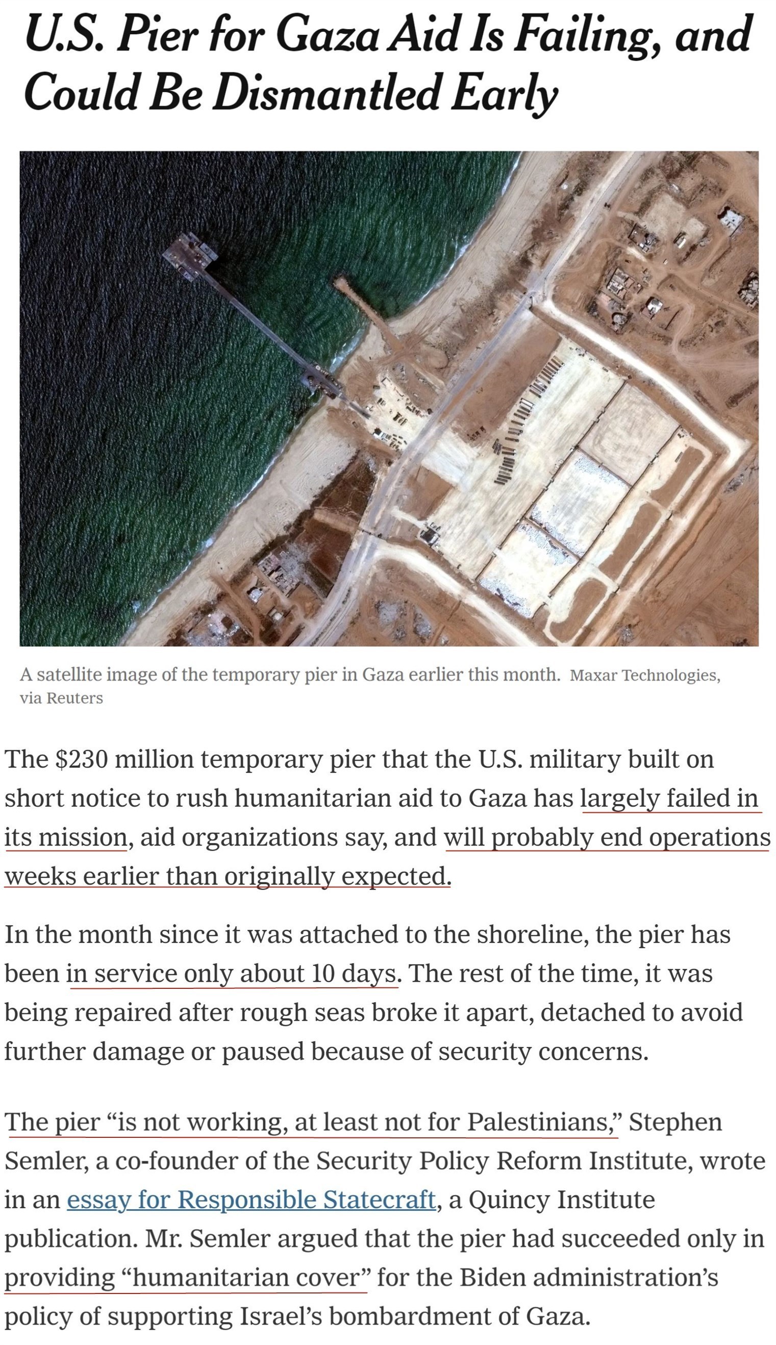 國際社會普遍批評說,建造這座臨時碼頭耗費(fèi)了大量的經(jīng)濟(jì)、外交和政治資源,得到的結(jié)果卻解決不了最根本的問題,美國的這番折騰無異于一場“人道主義表演”。