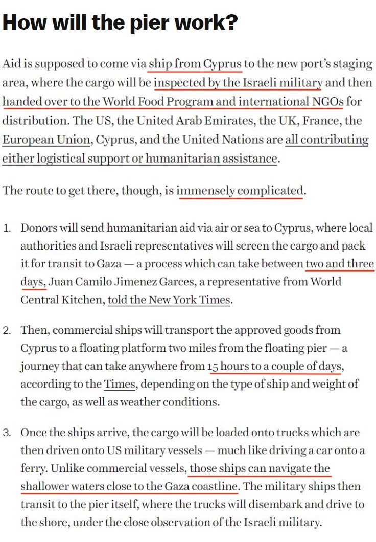 據(jù)美國沃克斯新聞網(wǎng)報道,救援物資首先要從塞浦路斯乘船抵達(dá)新碼頭的貨物集結(jié)地,并在那里接受以色列軍方的檢查,然后交給世界糧食計劃署和國際非政府組織進(jìn)行分發(fā)。整個過程將耗時數(shù)天時間,還要考慮到天氣狀況對船只的影響。