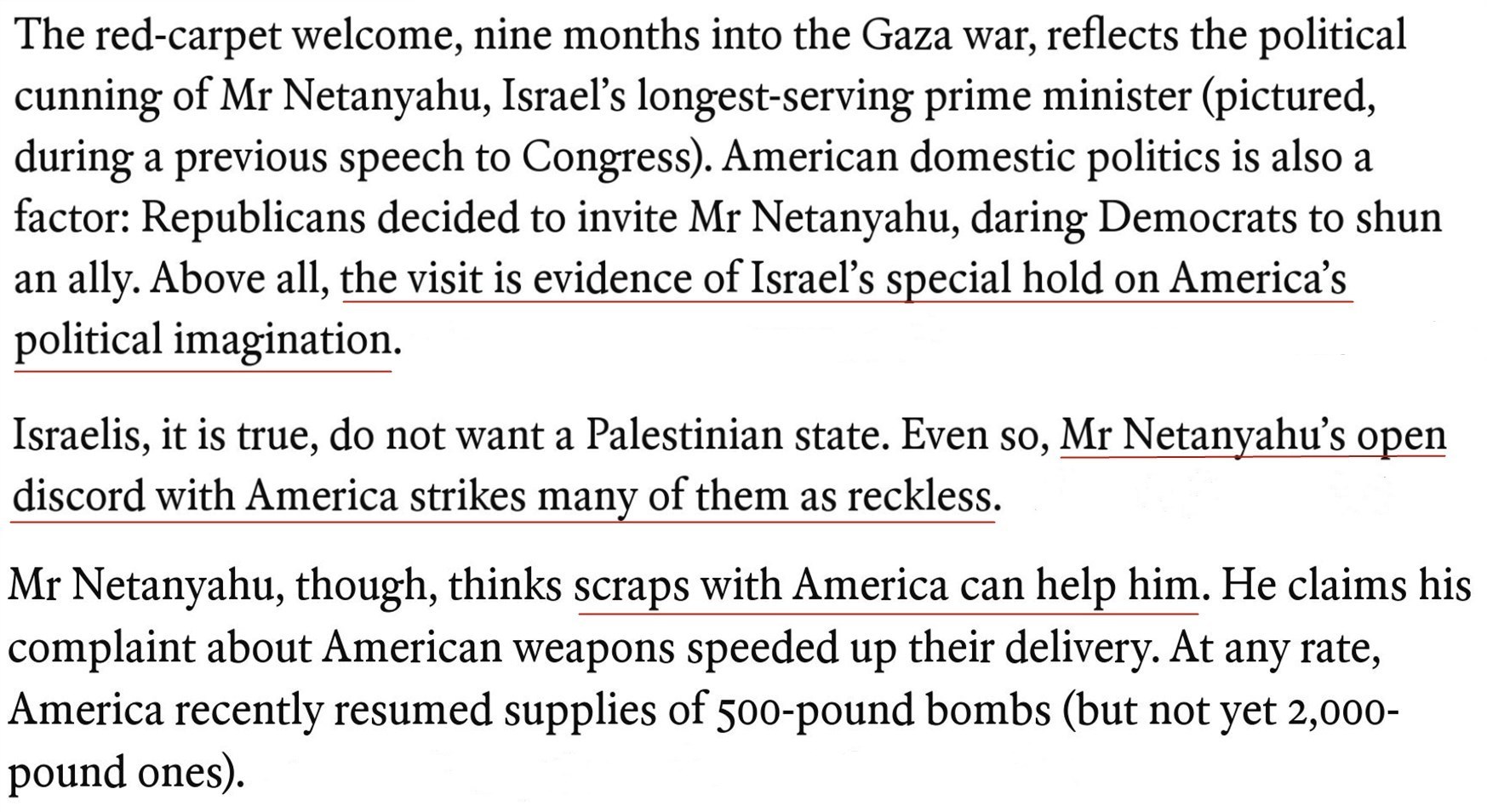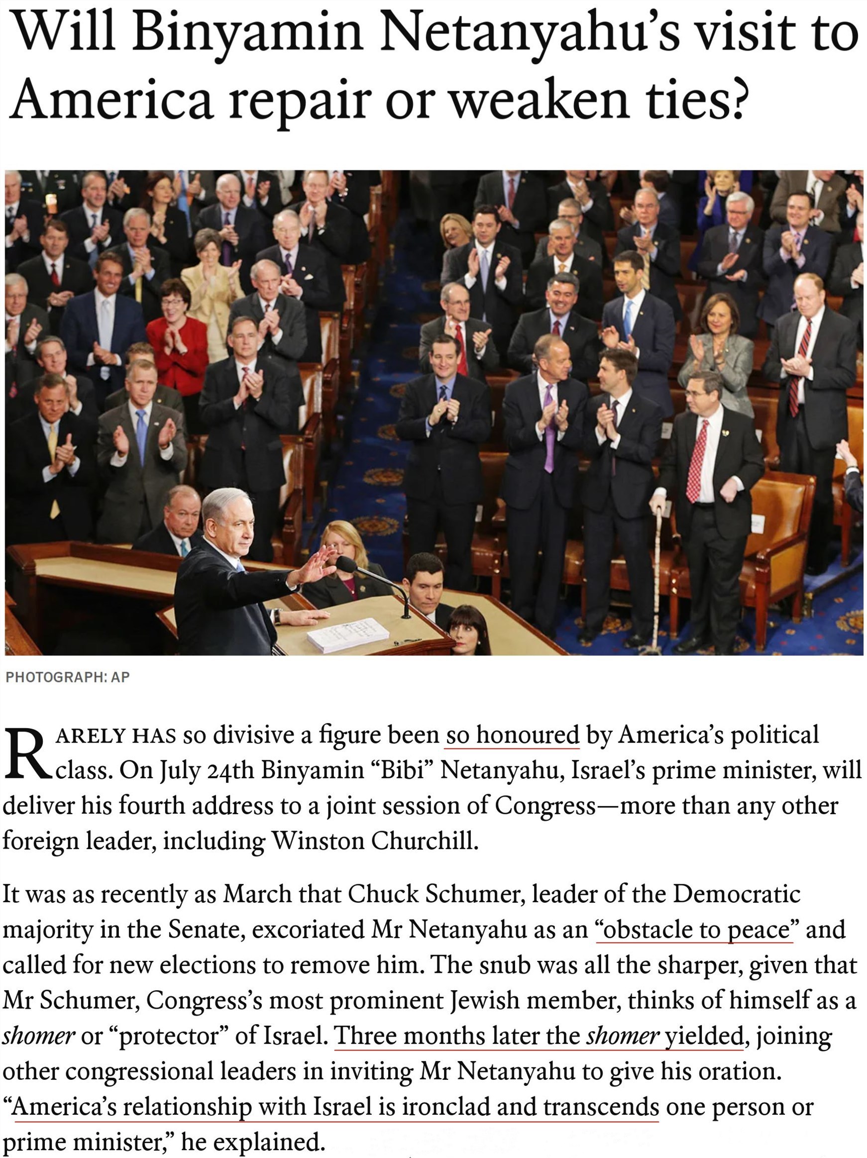 發(fā)生如此巨大的轉(zhuǎn)變,美國(guó)國(guó)內(nèi)政治是一個(gè)重要因素:共和黨人決定邀請(qǐng)內(nèi)塔尼亞胡,令民主黨人“不敢回避盟友”。最重要的是,“這次訪問證明了以色列對(duì)美國(guó)政治的特殊影響”。