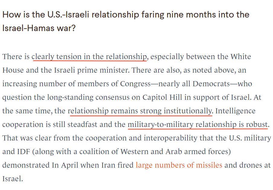 對(duì)于本輪巴以沖突爆發(fā)9個(gè)多月后的美以關(guān)系,美國(guó)外交關(guān)系協(xié)會(huì)的專家認(rèn)為,雖然白宮和以色列總理之間看起來分歧不斷,但同時(shí),這種關(guān)系“在制度上依然牢固”。