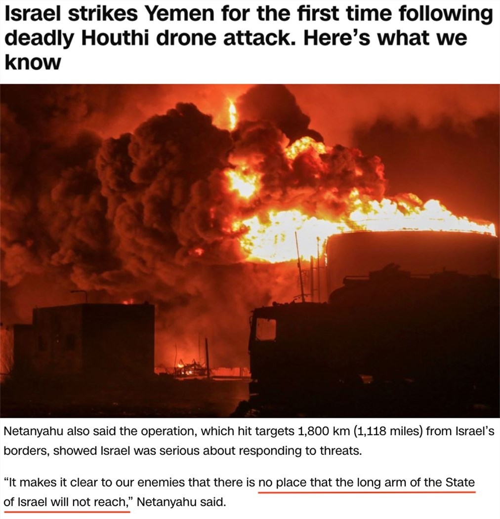 △美國(guó)有線電視新聞網(wǎng):內(nèi)塔尼亞胡稱,這次空襲“清楚地告訴敵人,沒有以色列的‘長(zhǎng)臂’無法觸及的地方”。