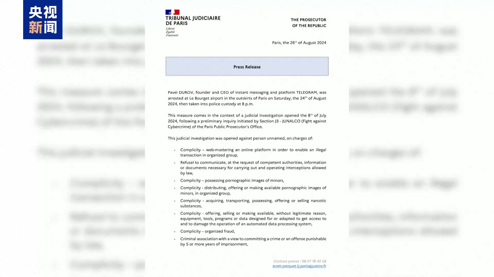 根據(jù)巴黎檢方26日的聲明,杜羅夫被逮捕并拘留是因涉及相關(guān)網(wǎng)絡(luò)犯罪調(diào)查。檢方稱,相關(guān)調(diào)查針對(duì)“電報(bào)”社交媒體平臺(tái)上涉及非法交易、兒童色情、販毒、欺詐等犯罪行為,杜羅夫被指是這些犯罪行為的共謀,并拒絕向當(dāng)局提供信息或文件。俄羅斯衛(wèi)星通訊社稱,杜羅夫案共涉及12項(xiàng)罪行。