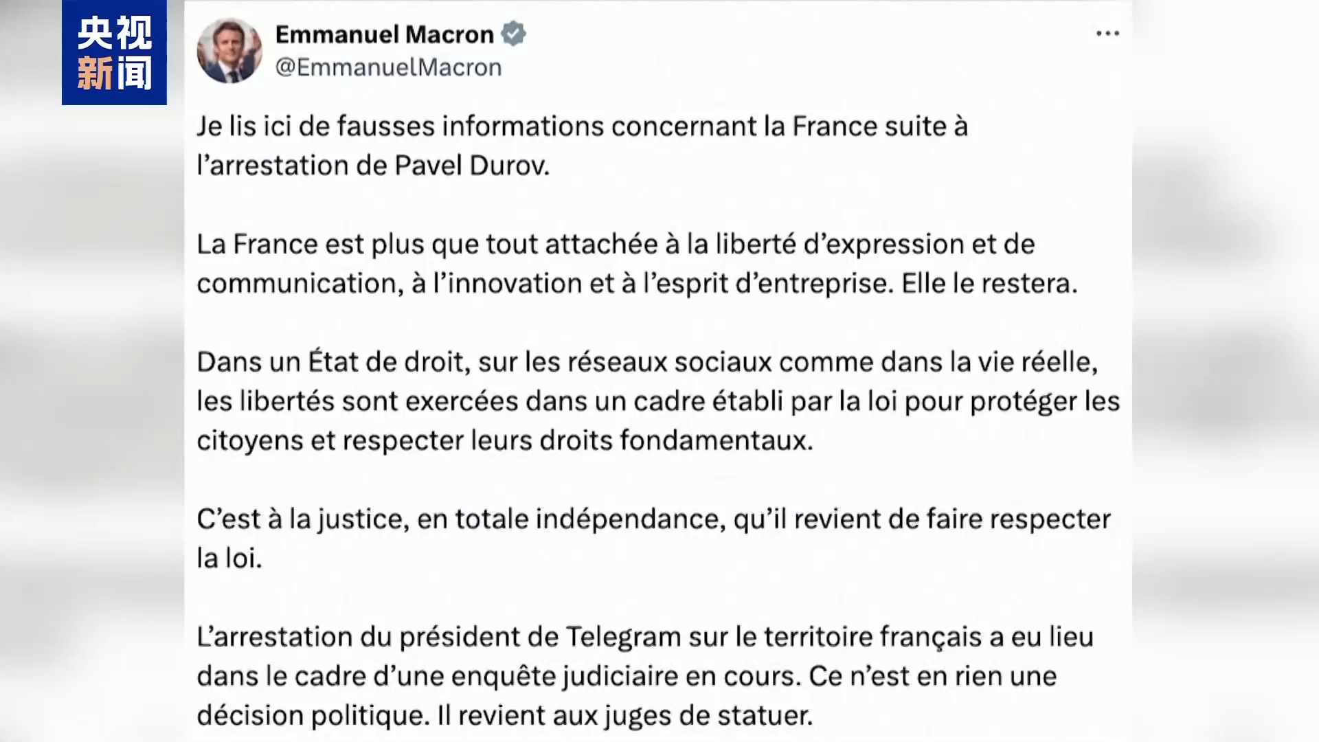 法國(guó)總統(tǒng)馬克龍26日通過社交媒體發(fā)文稱,在杜羅夫被捕后,他看到了部分有關(guān)法國(guó)的虛假信息。馬克龍稱,杜羅夫在法國(guó)被捕是正在進(jìn)行的司法調(diào)查的一部分,并非出于政治動(dòng)機(jī)。