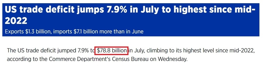 另一組由美國(guó)經(jīng)濟(jì)分析局和美國(guó)人口普查局公布的數(shù)據(jù)顯示,美國(guó)7月國(guó)際貿(mào)易逆差為788億美元,達(dá)到2022年年中以來(lái)的最高水平,逆差增幅高于分析師們的預(yù)期。