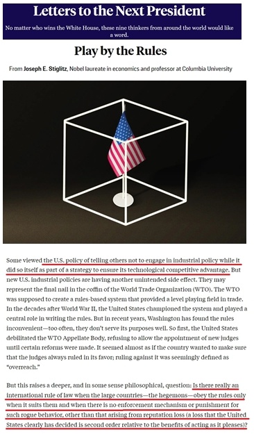 美國(guó)《外交政策》雜志刊登了一組《致下一位美國(guó)總統(tǒng)》的來(lái)信。其中,諾貝爾經(jīng)濟(jì)學(xué)獎(jiǎng)得主、美國(guó)哥倫比亞大學(xué)著名教授約瑟夫·施蒂格利茨致信稱,過(guò)去幾十年美國(guó)一直告誡其他國(guó)家不要推行產(chǎn)業(yè)政策,但如今,美國(guó)自己卻大搞產(chǎn)業(yè)政策,并推行一套維護(hù)自身技術(shù)優(yōu)勢(shì)的戰(zhàn)略。
