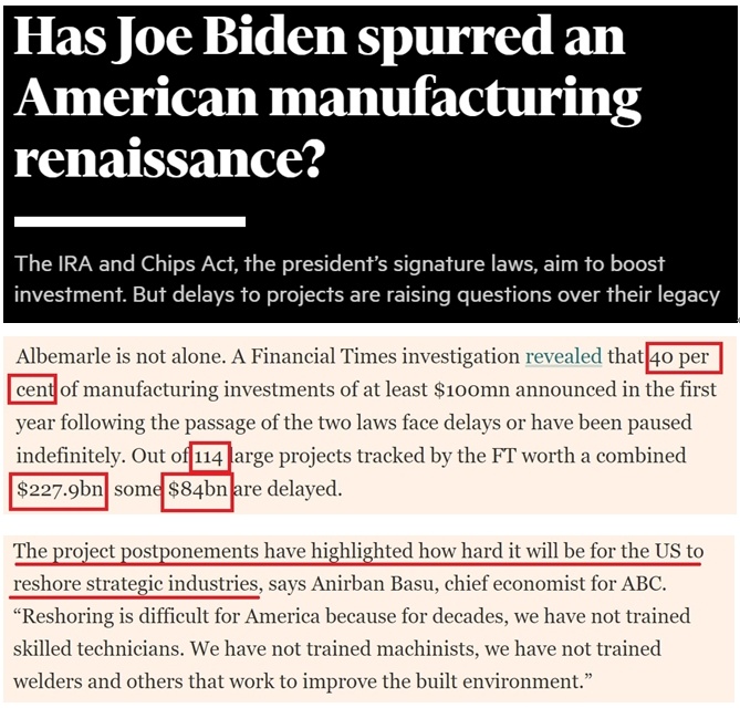 據(jù)《金融時(shí)報(bào)》調(diào)查,兩項(xiàng)法案生效第一年內(nèi)宣布的過(guò)億美元大項(xiàng)目中,約40%被推遲或無(wú)限期暫停。在《金融時(shí)報(bào)》追蹤的114個(gè)、總價(jià)值約2279億美元的大型項(xiàng)目中,總價(jià)值840億美元的項(xiàng)目被推遲。此外,還有一些項(xiàng)目推遲的消息尚未公布。