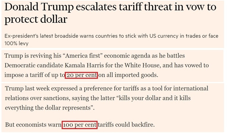 特朗普在競(jìng)選時(shí)再拿“美國(guó)優(yōu)先”經(jīng)濟(jì)議程說(shuō)事,誓言要對(duì)所有進(jìn)口商品征收高達(dá)20%的關(guān)稅。他甚至直言不諱地對(duì)包括歐盟在內(nèi)的美國(guó)貿(mào)易伙伴發(fā)出新的警告:如果敢在跟美國(guó)做生意時(shí)“去美元”,將面臨100%的美國(guó)關(guān)稅。