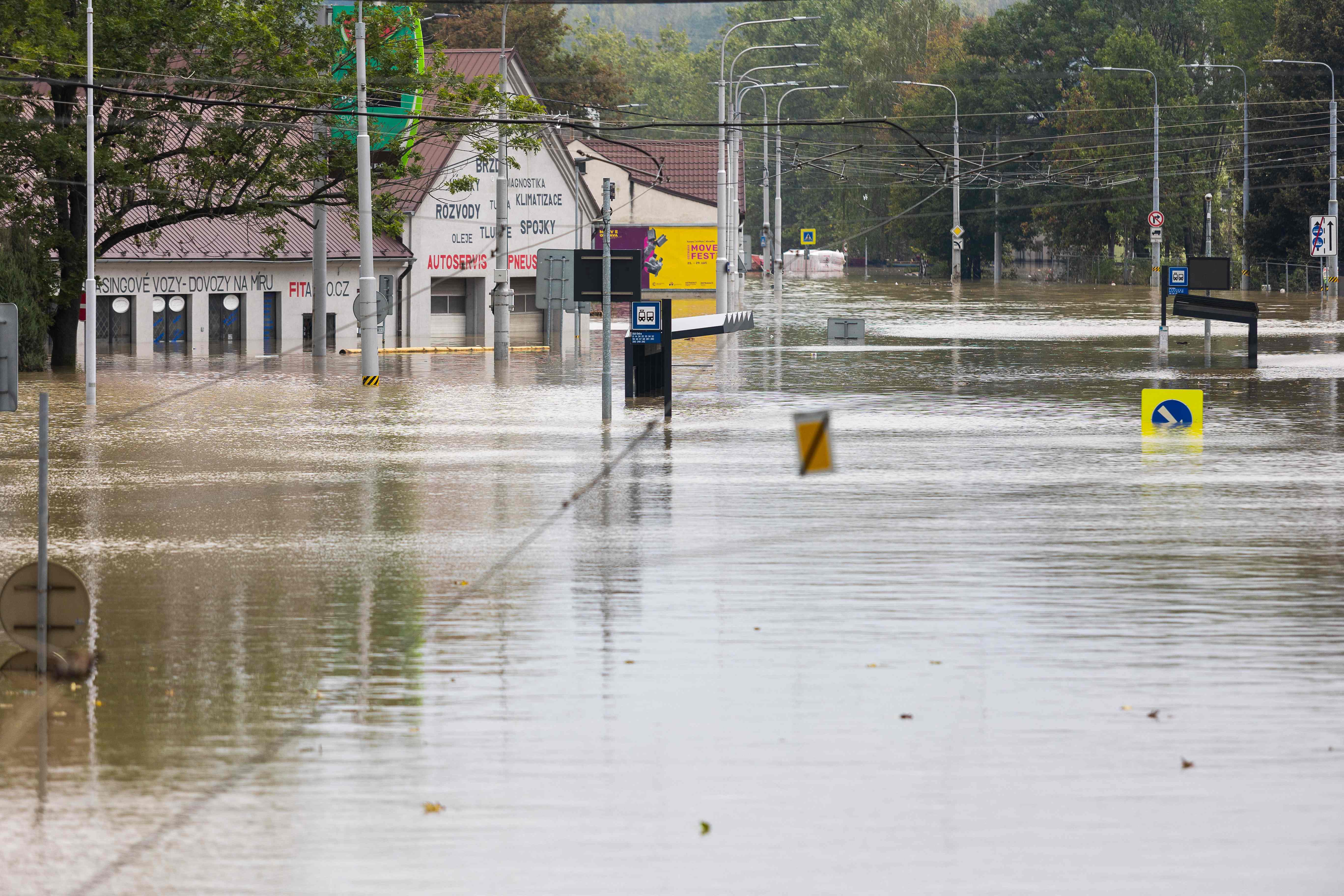 9月16日,捷克城市俄斯特拉發(fā)的街道被洪水淹沒。(法新社)