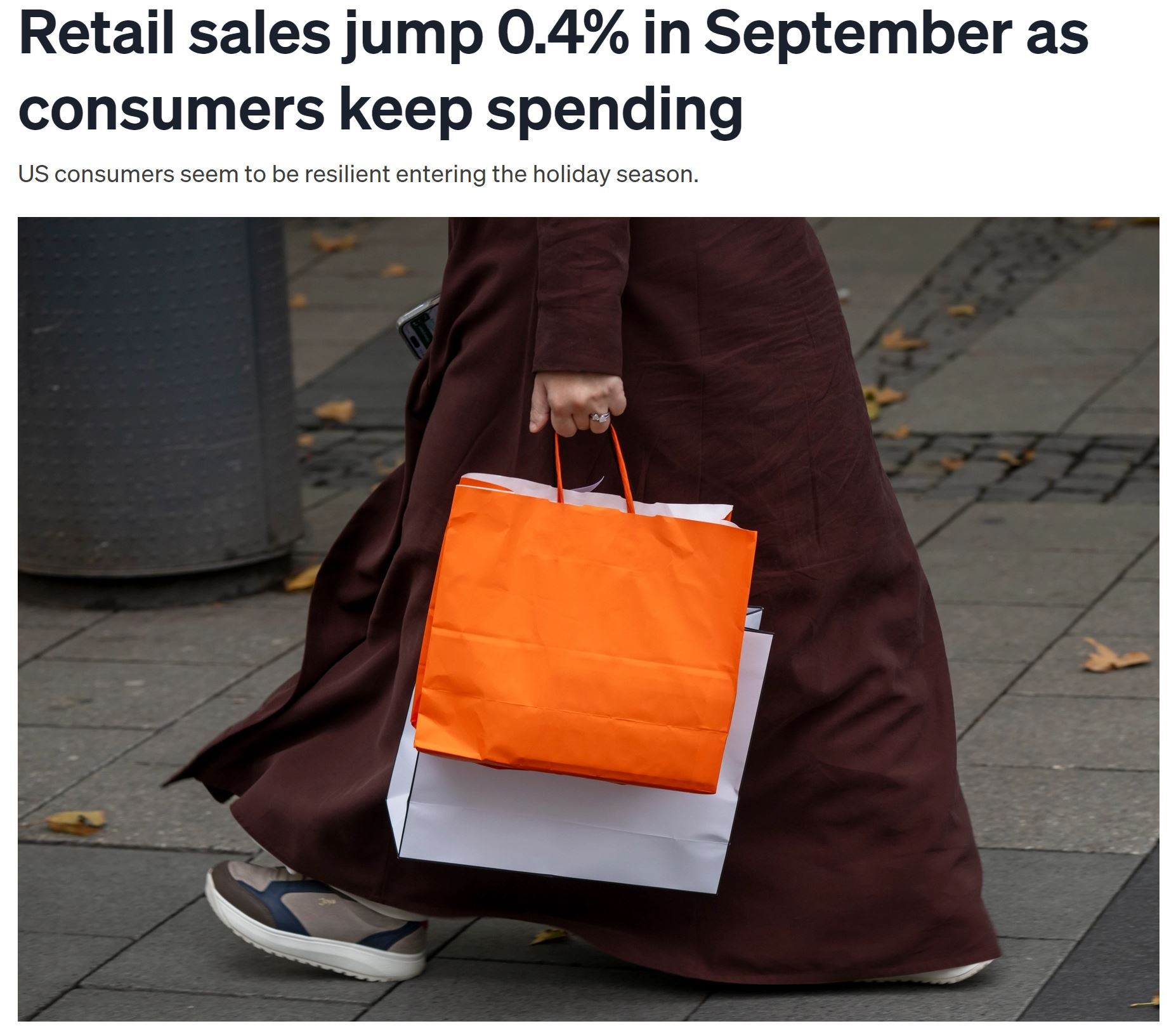 美國商務部17日公布的數(shù)據(jù)顯示,經(jīng)季節(jié)性因素調整后,9月美國消費者支出保持增長,零售銷售額環(huán)比增長0.4%,好于市場普遍預計的增長0.3%。