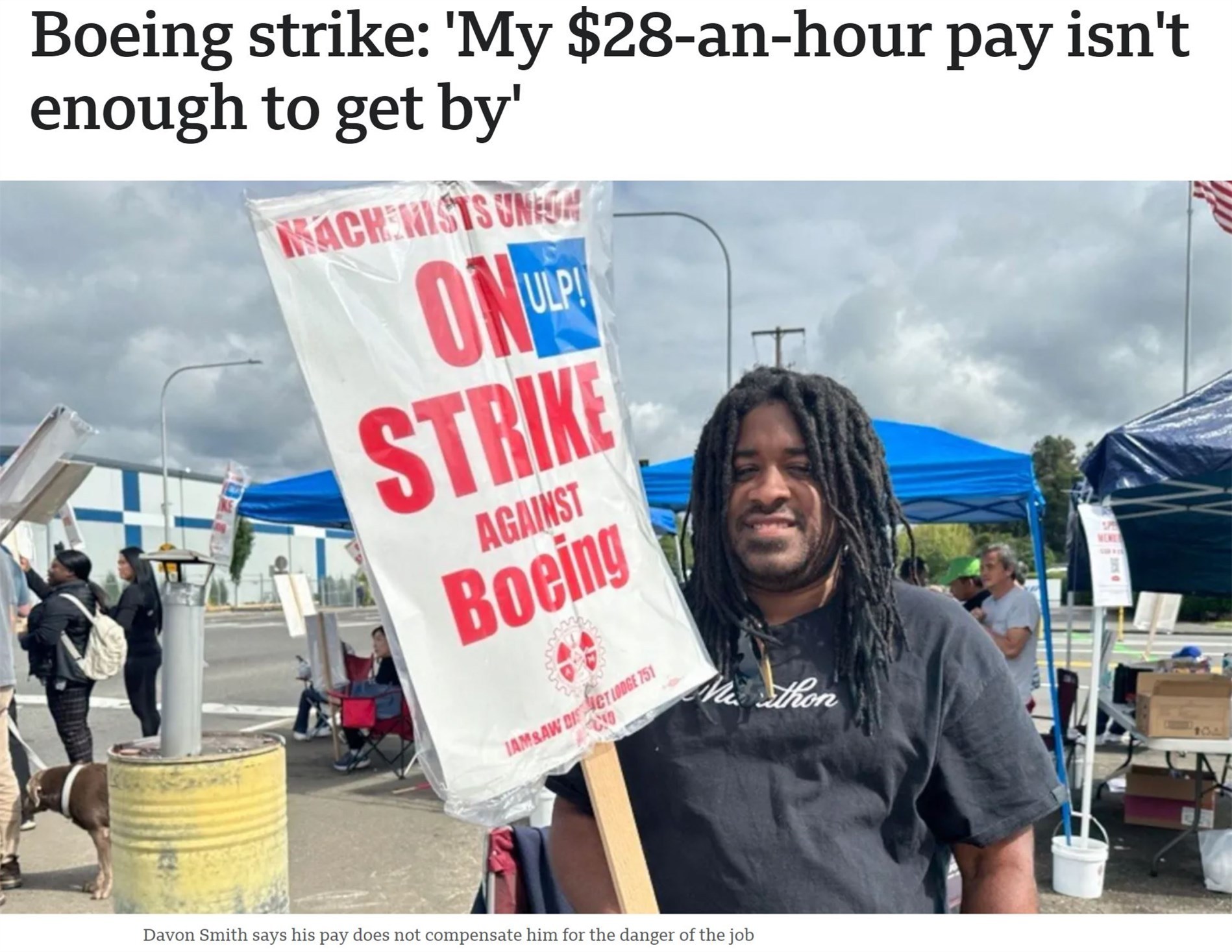 △英國廣播公司網(wǎng)站9月19日報道:參與罷工的波音員工稱,每小時28美元的工資不足以維持生計。