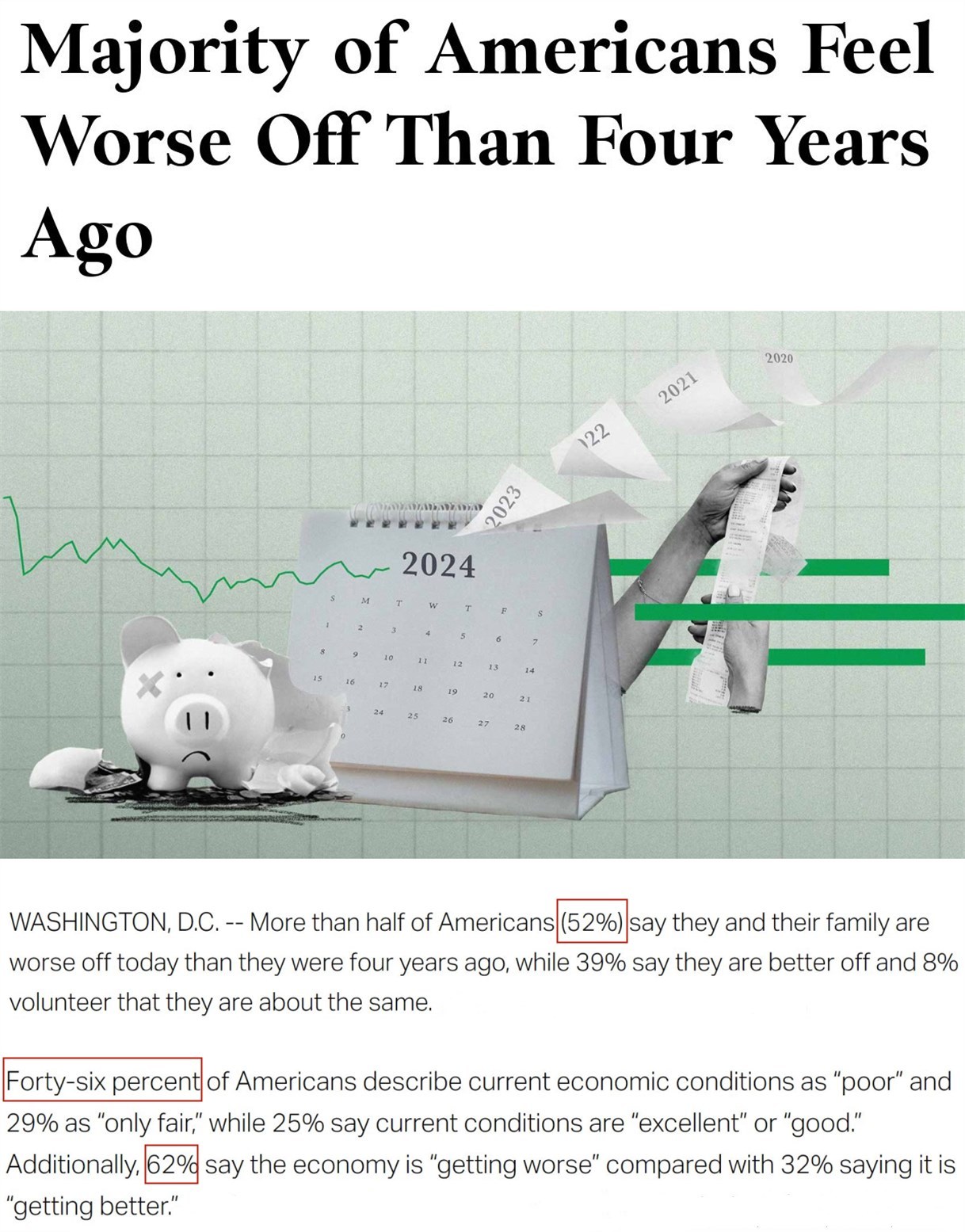 美國蓋洛普咨詢公司18日公布的一項民意調查結果顯示,52%的美國受訪者表示他們和家人現(xiàn)在的生活比四年前更糟糕。另有約46%的受訪者表示他們認為目前的經(jīng)濟狀況“糟糕”,62%的受訪者認為經(jīng)濟“正在惡化”。