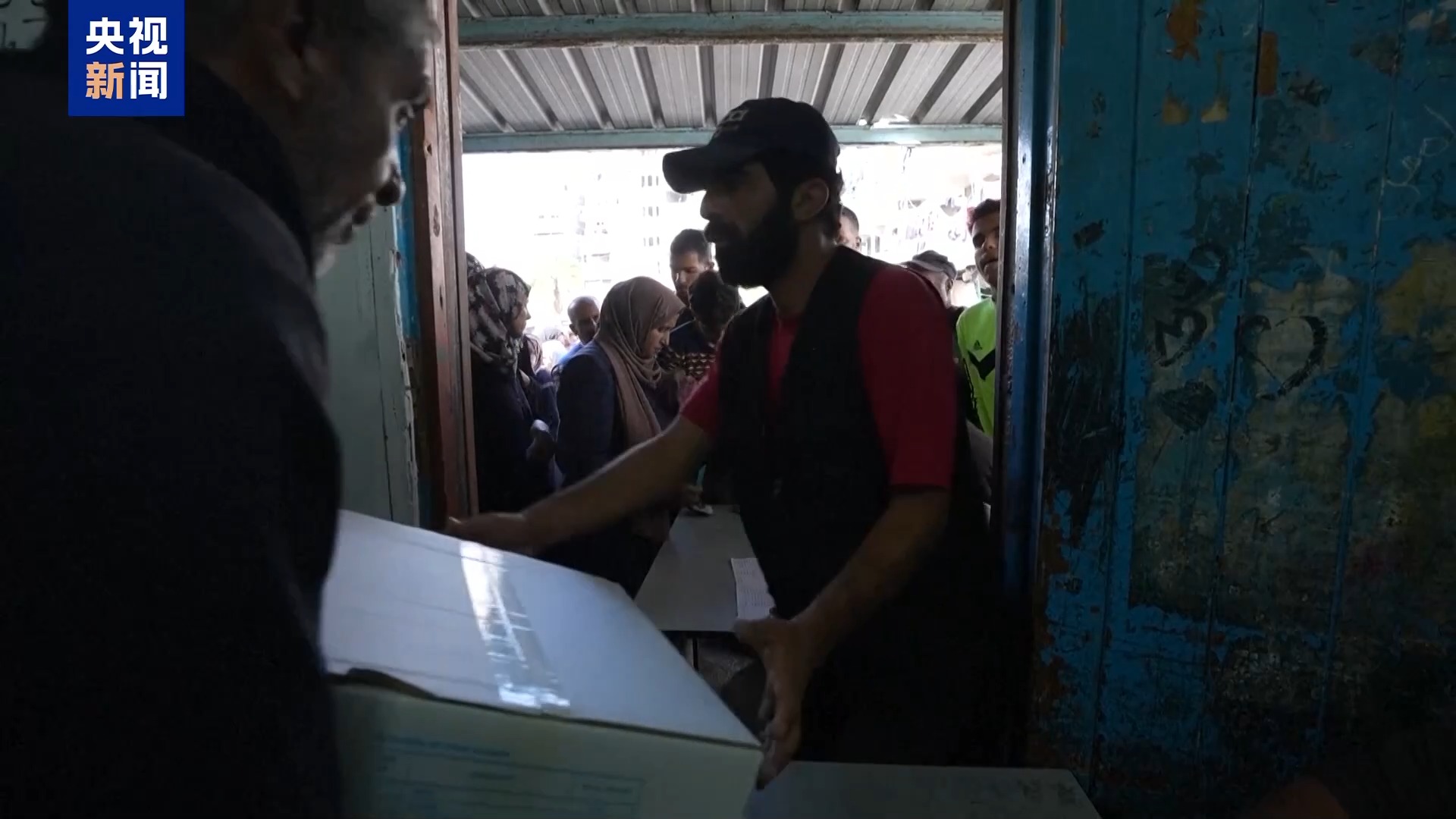 在加沙地帶中部的努賽賴特難民營,暫居于此的流離失所者正在聯(lián)合國近東救濟(jì)工程處的援助點(diǎn)前排起長隊(duì),而工作人員們繼續(xù)向排隊(duì)的流離失所者分發(fā)援助物資。