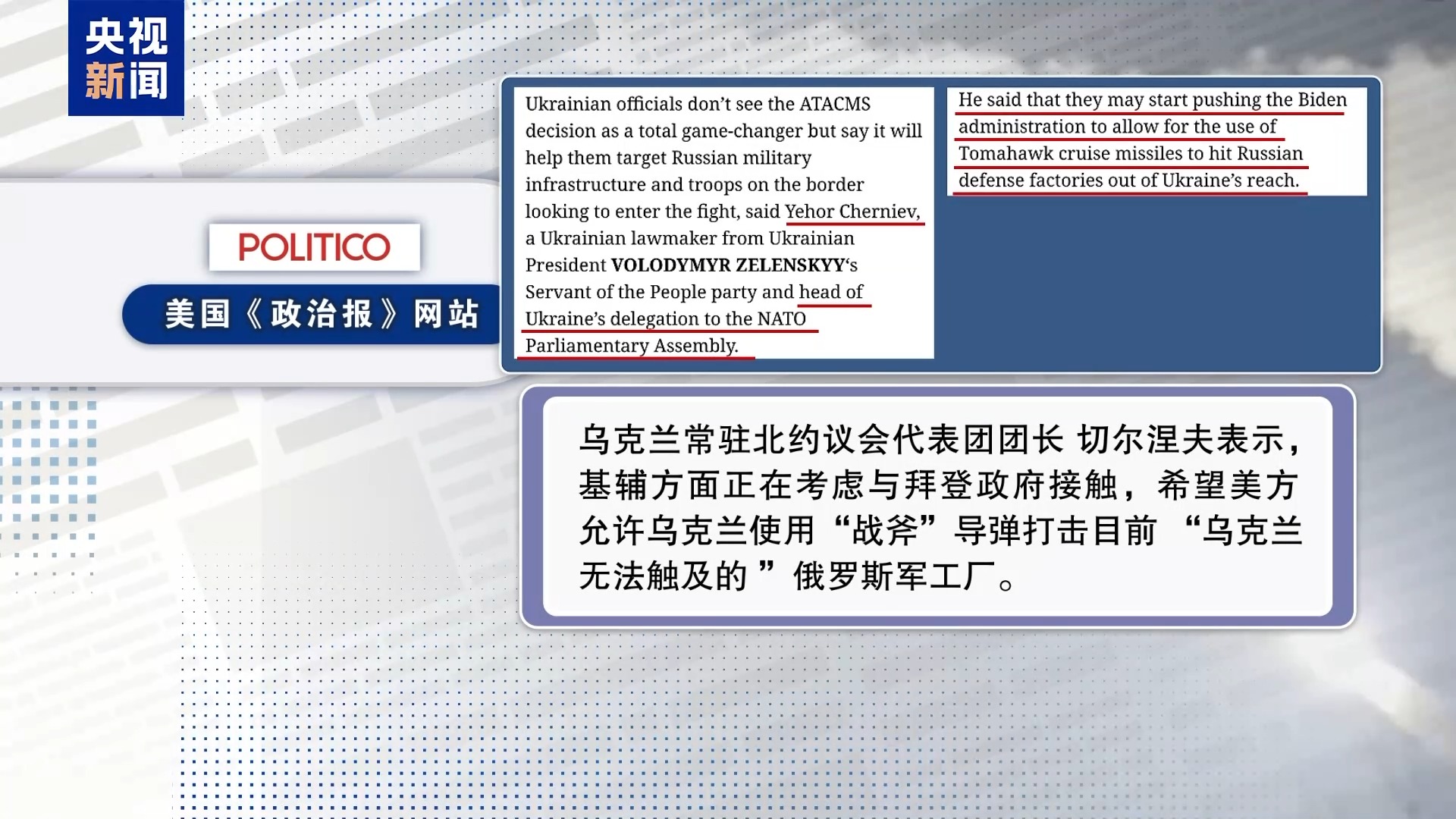 烏克蘭常駐北約議會代表團(tuán)團(tuán)長切爾涅夫表示,基輔方面正在考慮與拜登政府接觸,希望美方允許烏克蘭使用“戰(zhàn)斧”導(dǎo)彈打擊目前 “烏克蘭無法觸及的”俄羅斯軍工廠。他補(bǔ)充道,烏克蘭官員擔(dān)心,即將上臺的特朗普政府可能會對批準(zhǔn)此類授權(quán)更加猶豫不決,而可能會將其“作為與俄羅斯人談判的籌碼”。
