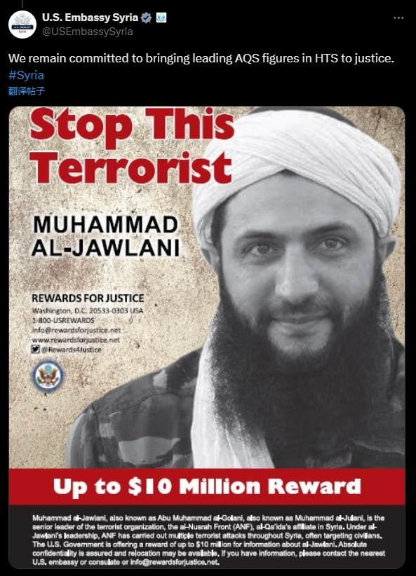 ▲美國駐敘利亞大使館在社交媒體發(fā)布的懸賞令