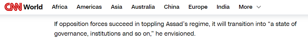 近日,朱拉尼在接受美國有線電視新聞網(wǎng)的采訪時表示,雖然他組建“解放敘利亞”聯(lián)盟的目的是推翻巴沙爾·阿薩德政府,但今后會將敘利亞轉(zhuǎn)變?yōu)橐粋€“有治理、有機構(gòu)的國家”。