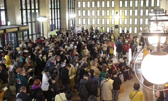 △22日,集會人群聚集在沖繩市民會館門口。(圖源:琉球新報)