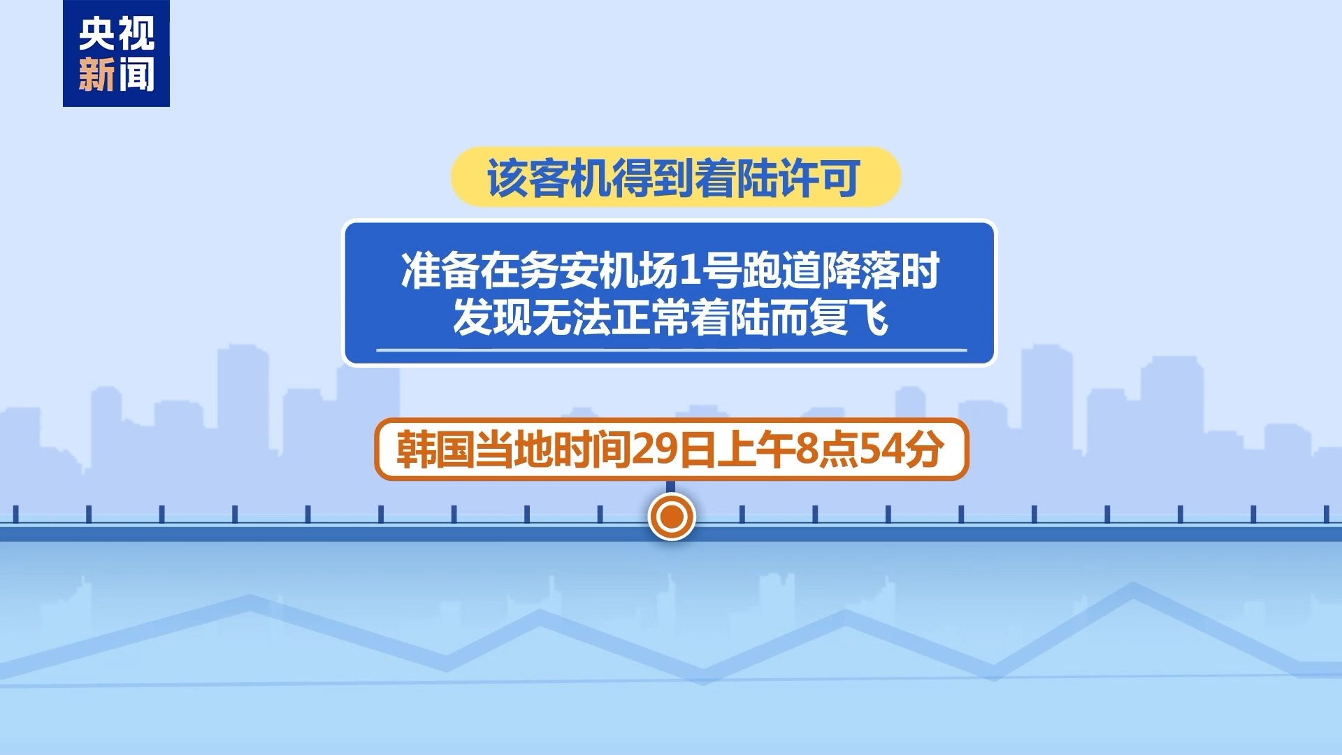韓國當(dāng)?shù)貢r間29日8時54分,該客機(jī)得到著陸許可,準(zhǔn)備在務(wù)安機(jī)場1號跑道降落時發(fā)現(xiàn)無法正常著陸而復(fù)飛。