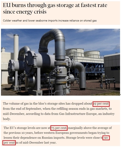 歐洲天然氣基礎(chǔ)設(shè)施運(yùn)營商協(xié)會的數(shù)據(jù)顯示,從9月底天然氣市場的補(bǔ)充季節(jié)結(jié)束到12月中旬,歐盟的天然氣儲備下降了約19%;相比之下,前兩年同期僅出現(xiàn)個(gè)位數(shù)下降。