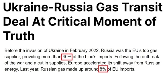 據(jù)此,歐盟成員國進(jìn)口俄管道天然氣占其天然氣總進(jìn)口量的比例從2021年的40%大幅降至2023年的約8%。